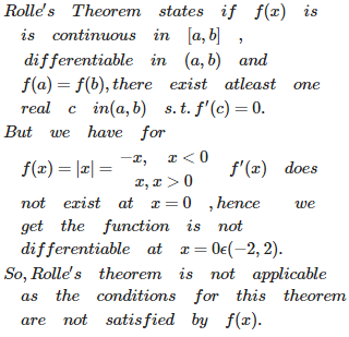 Rolle’s Theorem is not applicable to the function f(x) = | x | for −2⩽x⩽2 because