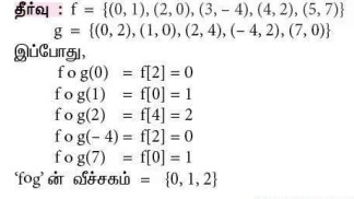 g = {(0, 2), (1, 0), (2, 4), (‒4, 2), (7, 0)} எனக் கொடுக்கப்பட்டால் f o g‒ன் வீச்சகமானது