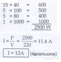 ஒரு பெரிய கட்டிடத்தில், 40W மின்விளக்குகள் 15, 100W மின்விளக்குகள் 5, 80 W மின்விசிறிகள் 5 மற்றும் 1 kW மின் சூடேற்றி 1 ஆகியவை இணைக்கப்பட்டுள்ளன. மின் மூலத்தின் மின்னழுத்தம் 220V எனில் கட்டிடத்தின் மைய மின் உருகியின் அதிக பட்ச மின்னோட்டம் தாங்கும் அளவு