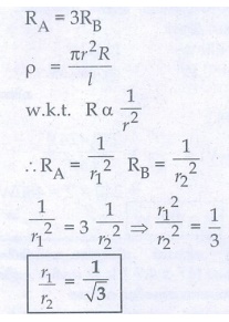 ஒரே நீளமும் மற்றும் ஒரே பொருளால் செய்யப்பட்ட A மற்றும் B என்ற இரு கம்பிகள் வட்ட வடிவ குறுக்கு பரப்பையும் கொண்டுள்ளன. RA = 3RB எனில் A கம்பியின் ஆரத்திற்கும் B கம்பியின் ஆரத்திற்கும் இடைப்பட்ட தகவு என்ன?