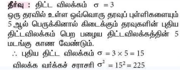 ஒரு தரவின் திட்டவிலக்கமானது 3. ஒவ்வொரு மதிப்பையும் 5‒ஆல் பெருக்கினால் கிடைக்கும் புதிய தரவின் விலக்க வர்க்கச் சராசரியானது