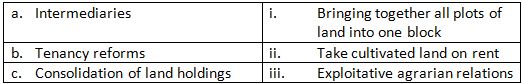 Intermediaries refers to people between the tiller and the state. they should be abolished as they bring stagnation in the Indian agricultural sector. The tenancy reforms laws provide the provisions for registration of tenants, or giving ownership rights to the former tenants to bring them directly under the state. Consolidation of land holdings refers to bringing together all plots of land into one block.